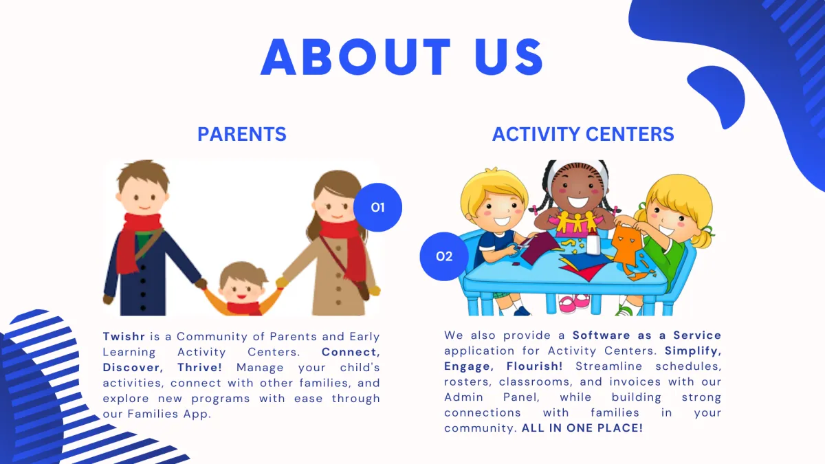 Discover the Twishr Difference: Navigating activity options for your child can be overwhelming. That's why we crafted Twishr. Say goodbye to guesswork – we show you which centers have happy kids and open slots. Connect directly with parents who already go there, gaining insights straight from the source. Picture this: carpooling, shared hobbies, and new friendships for both kids and parents. Twishr makes finding the perfect fit a breeze, revolutionizing the way activity centers thrive.